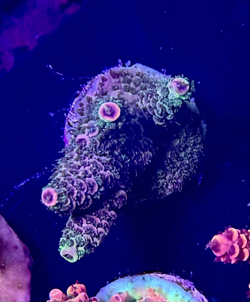 This Millie is PURE MAGIC! Fast growing with fluffy purple polyps, pink and green corallites and bright pink tips! Hand-picked in INDO, homegrown at New Wave!